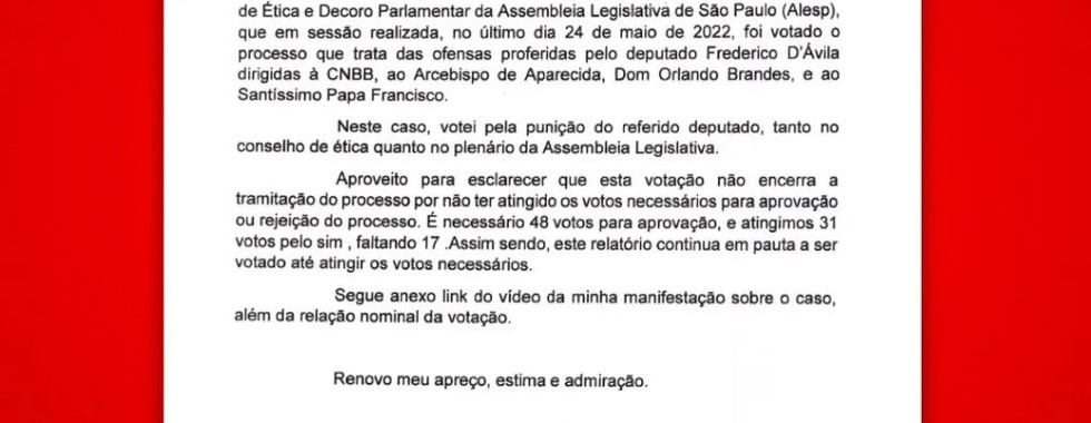 Hoje encaminhei ofício aos cuidados do Arcebispo de Aparecida, Dom Orlando Brandes; ao Arcebispo de Mogi das Cruzes, Dom Pedro Luiz Stringhini; ao Bispo de Santo Amaro, Dom José Negri; e demais Padres e leigos; comunicando sobre a votação, realizada no dia 24/05/22, do relatório do Conselho de Ética e Decoro Parlamentar da Assembleia Legislativa de São Paulo (Alesp) que pede punição do deputado Frederico D’Ávila pelas ofensas por ele proferidas à CNBB, ao Arcebispo de Aparecida, Dom Orlando Brandes, e ao Santíssimo Papa Francisco.